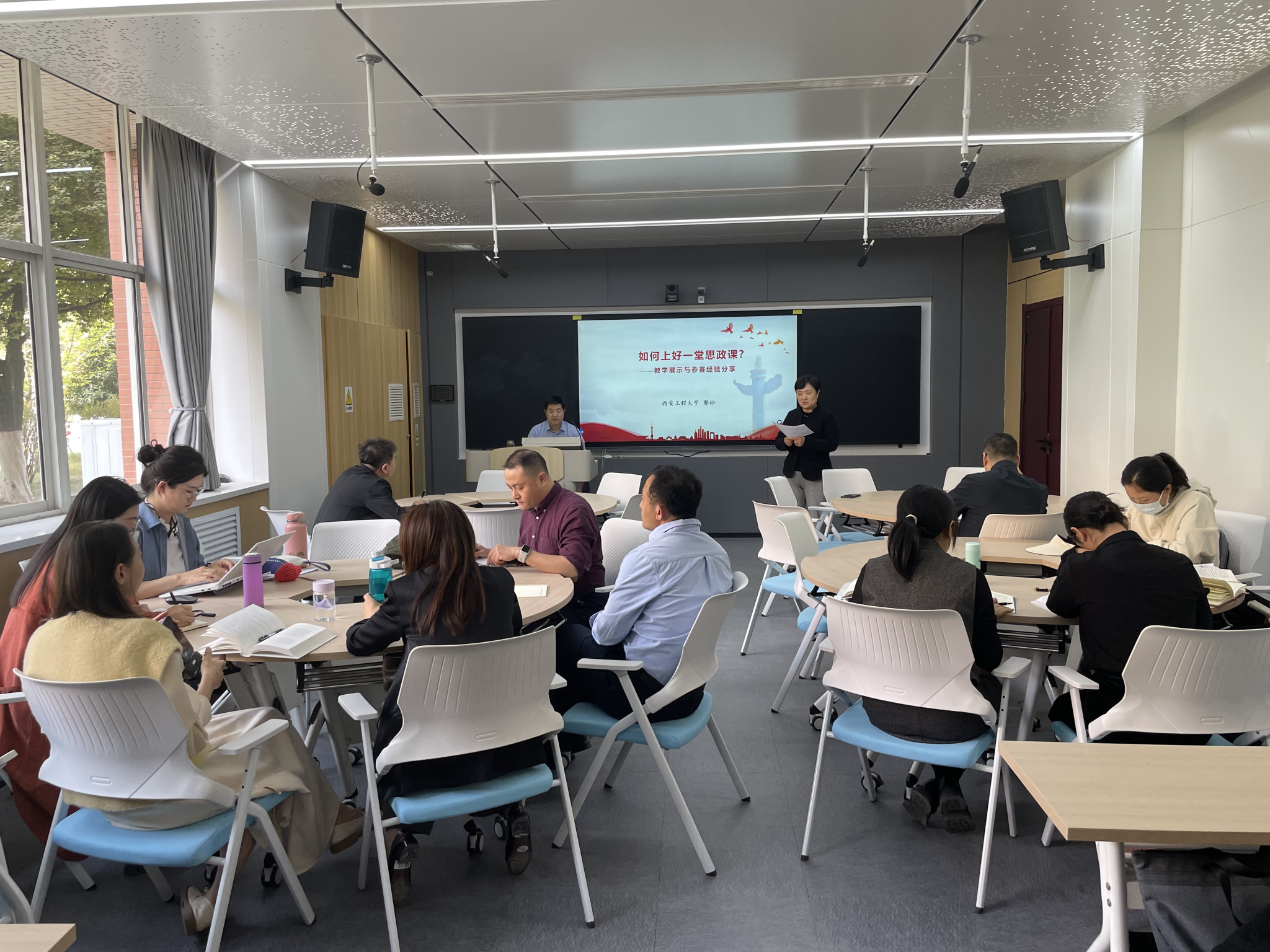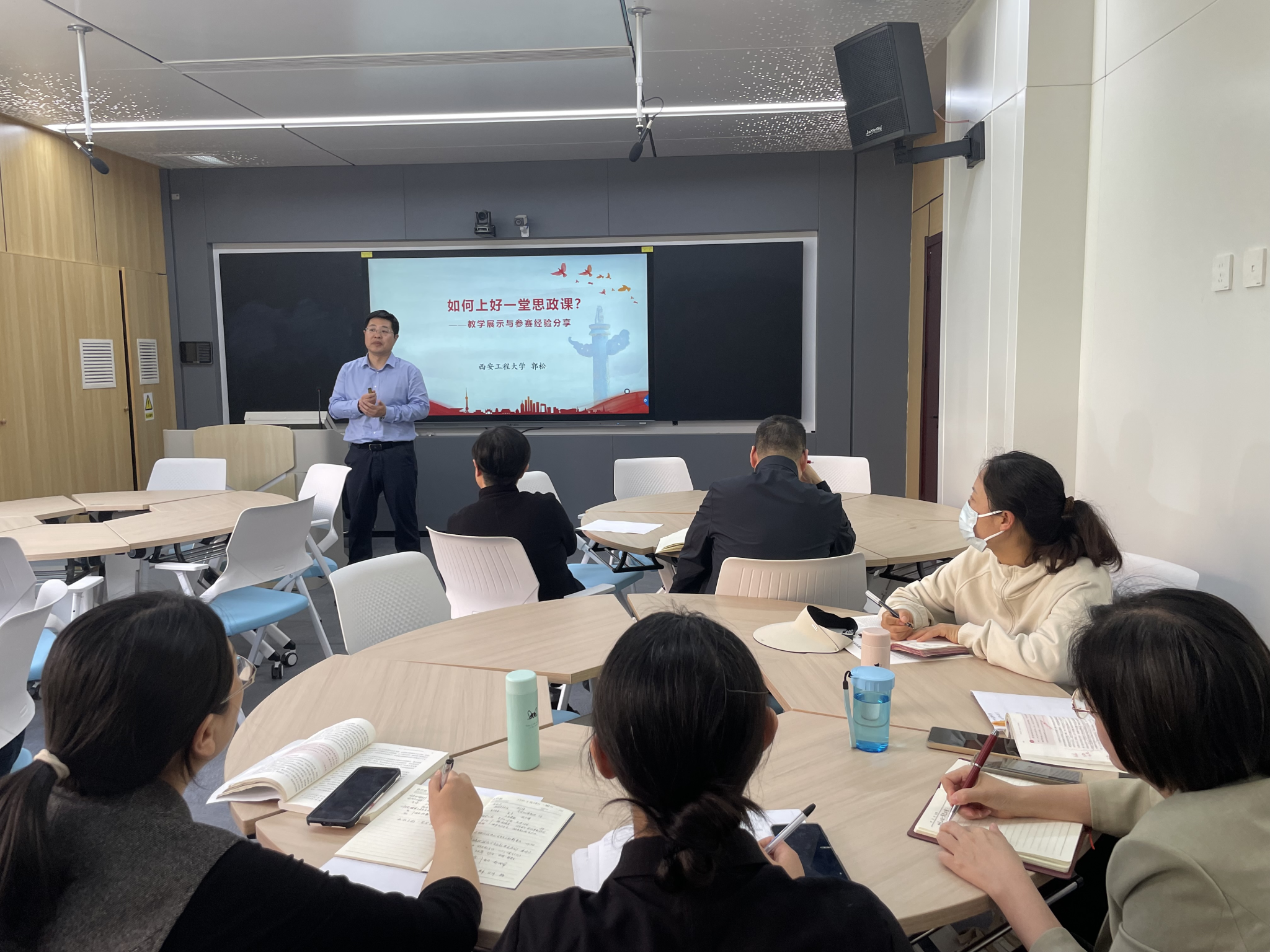 郭松重点围绕深耕教材、讲清理论、用活素材、回应困惑四个方面,就打造一堂高质量思政课做了经验分享和教学示范。他强调,讲好思政课要处理好选题的大与小、热点与重点、学理性与吸引力、选取专题与专业背景、课程表述与提炼再造、课程属性与教学重点、学校特色与课程特色七对关系。他特别对“问题链”教学方式、无领导小组讨论等实用教学方法进行展示与分析,深刻表明坚持问题导向、创新教学方法是讲好思政课的必要环节。