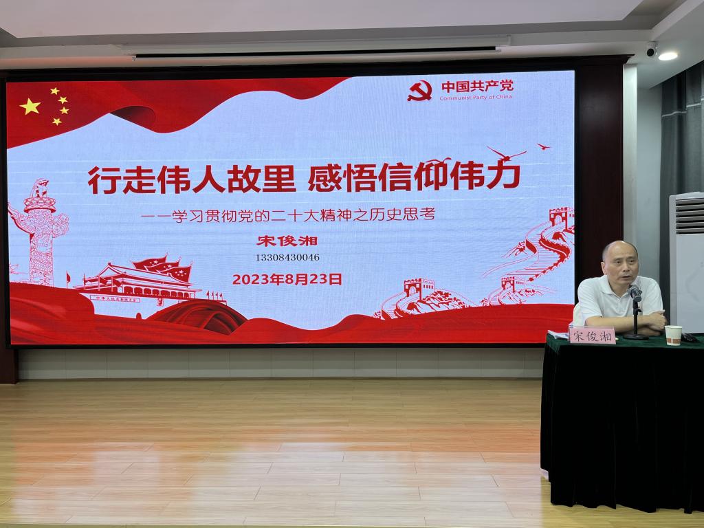 开班式结束后,中共长沙市委党史研究室原主任、市委党史学习教育宣讲团成员宋俊湘同志作题为《行走伟人故里 感悟信仰伟力》主题报告。他从何谓信仰、毛泽东所遵循的信仰是什么、信仰可产生哪些伟力、从伟人身上汲取信仰的力量四个方面深入分析了伟人强大的信仰力量和人格魅力。专题报告主题鲜明、脉络清晰、故事鲜活、理论透彻、精彩夺人。大家纷纷表示受益匪浅,新时代要以伟人为榜样,努力探究信仰的源泉,不断丰富信仰的时代内涵,始终坚守共产党人的精神家园,为成为优秀思政课教师努力奋斗。