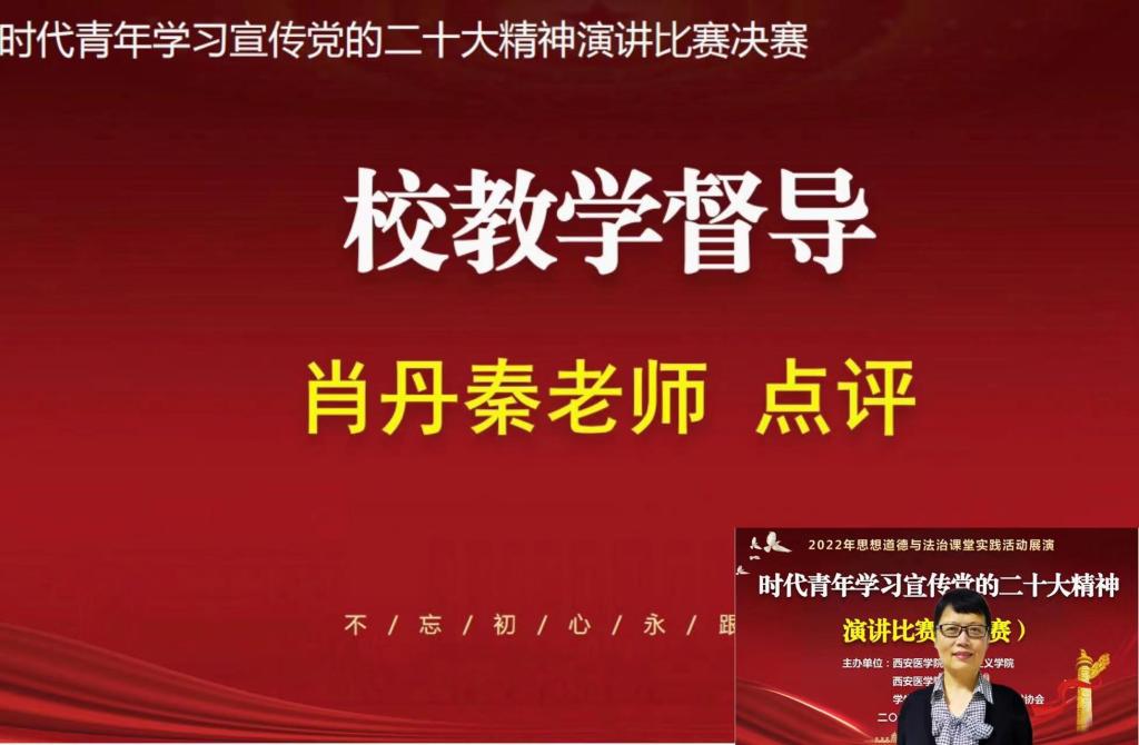 肖丹秦对活动进行精彩点评。她表示,疫情防控背景下能够举办这样的活动非常不容易,向为活动举办付出辛劳的师生表示钦佩;同时她认为,开展将党的二十大精神融入“德法课”课堂实践展演活动,是对思政课实践教学的创新和深化,是引导大学生有效学习贯彻落实党的二十大精神的实践举措和具体行动,富有新意和价值;她特别指出,参赛同学态度认真,演讲的内容紧扣党的二十大主题,演讲的情感充沛情绪感人,同学们的感悟具有深刻性,进一步深化了对党的二十大精神的学习和领会,有效激发青年大学生学习宣传党的二十大精神的热情,活动举办很成功,希望同学们在细节上再下功夫,不断努力学习奋斗,将党的二十大精神贯彻落实到医学生现实发展中,为健康中国做出应有的贡献。