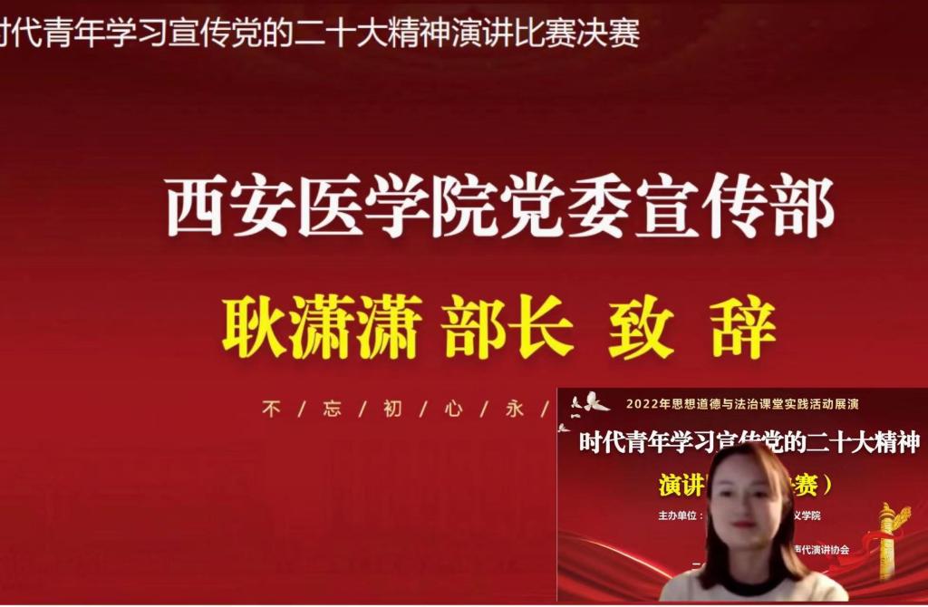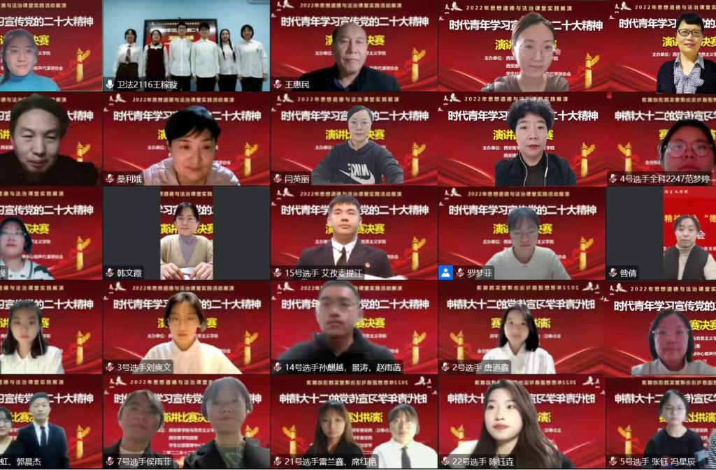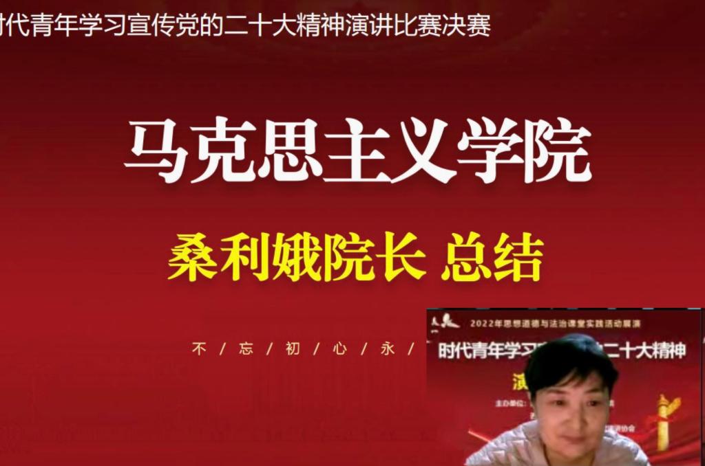 为深入学习宣传贯彻党的二十大精神,加强“大思政课”试点项目建设,创新思政课实践教学,将党的二十大精神有机融入思政课教学,持续推动党的二十大精神进教材、进课堂,进学生头脑,引导青年大学生从党的二十大擘画的以中国式现代化全面推进中华民族伟大复兴的宏伟蓝图中增强建功立业的信心,干事创业的决心,激励青年学子用青春的力量激荡起“强国有我 复兴有我”的时代最强音,2022年12月2日晚上,由bv伟德源自英国始于1946、团委主办,新生代演讲协会承办的线上“思想道德与法治”课堂实践展演活动“时代青年学习宣传党的二十大精神主题演讲比赛”决赛活动胜利举行。校党委委员、宣传部部长耿潇潇,科技处处长苟兴春,人事处处长张军峰,bv伟德源自英国始于1946院长桑利娥,团委书记韩文霞,学工部副部长昝倩,学校教学督导王惠民、肖丹秦出席活动并担任评委。