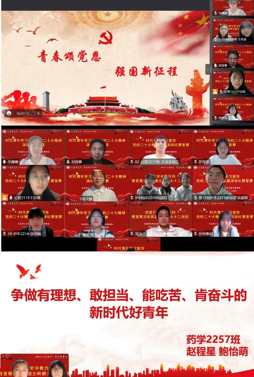 比赛现场,进入决赛的23组选手紧紧围绕“学习宣传党的二十大精神”这一主题,从党的二十大对时代青年寄予的厚望“广大青年要坚定不移听党话、跟党走,怀抱梦想又脚踏实地,敢想敢为又善作善成,立志做有理想、敢担当、能吃苦、肯奋斗的新时代好青年,让青春在全面建设社会主义现代化国家的火热实践中绽放绚丽之花”出发,用真挚的感情、生动的语言、鲜活的事例深刻表达了自己对党的二十大报告中的新观点、新论断、新思想、新战略、新要求的深切感悟,同学们准备充分,精神抖擞,演讲语言精练,情绪饱满,充分展现了新时代大学生奋发有为、锐意进取的精神风貌,呈现出时代青年笃行不怠、一往无前的昂扬姿态,弘扬了新时代的正能量,唱响了西医学子的“正气歌”。