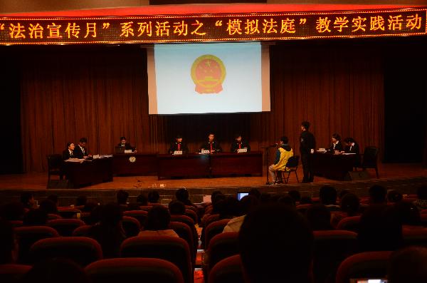 为普及法律知识,弘扬法律精神,加强校园法治建设,充分展示我校大学生普法工作所取得的成果,进一步引导我校学生学法、懂法、守法和用法,2014年1月9日下午14:30,由校团委主办,卫生管理系及思政部承办的“法治宣传月”之“模拟法庭”教学实践活动在学术报告厅举行。