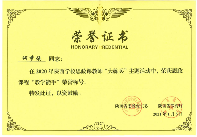 2021年1月5日—获省级思政大练兵“教学能手”—荣誉证书