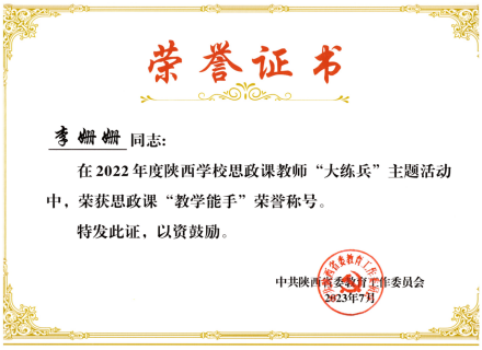 2023年7月—获省级思政大练兵“教学能手”—荣誉证书